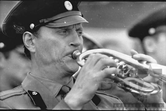 repülőnap katonaság repülőtér zenész katona egyenruha légi bemutató MHSZ hangszer Őcsény Tolna megye 1973 Bakó Jenő MagyarországFotó részletei