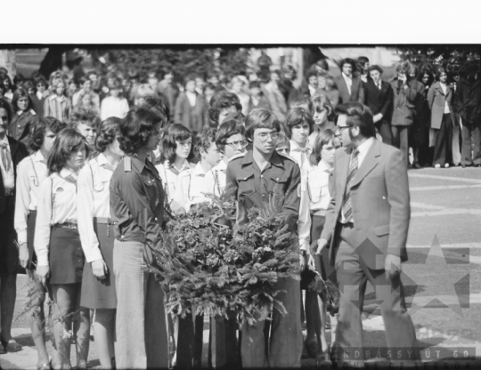 szocialista állami ünnep április 4. koszorúzás szovjet emlékmű úttörő Ifjú Gárda ifjúsági mozgalmi élet egyenruha koszorú Szekszárd Tolna megye Magyarország 1976 Bakó JenőFotó részletei