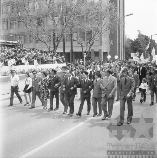 szocialista állami ünnep május 1. munka ünnepe felvonulás utcakép néphadsereg katona egyenruha transzparens úttörő tribün Szekszárd Tolna megye Magyarország 1977 Bakó JenőFotó részletei