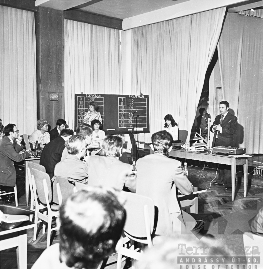 AZONOSÍTÓ: THM-BJ-00716a A rendezvény résztvevői. [A szocialista brigádmozgalom szovjet mintára az 1950-es évek végén kezdett kibontakozni Magyarországon, és rendszerváltoztatáskor szűnt meg. Kezdetben csak az ipari üzemekben és gyárakban alakultak meg a brigádok, majd az agráriumban és a hivatali szférában is létrejöttek. A mozgalom jelszava: „Szocialista módon dolgozni, tanulni és élni” volt.] HELYSZÍN: Szekszárd, Tolna megye DÁTUM: 1977 FOTÓS: Bakó Jenő