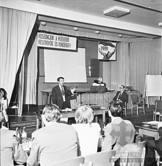 szocialista állami ünnep Belügyminisztérium rendőr csapat vetélkedő március 21. vetítővászon diavetítő transzparens mikrofon proletárdiktatúra évforduló tanácsköztársaság Szekszárd Tolna megye Magyarország 1979 Bakó Jenő