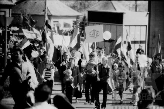 szocialista állami ünnep május 1. munka ünnepe transzparens zászló felvonulás utcakép lufi gyerek Paks Tolna megye Magyarország 1981 Bakó JenőFotó részletei