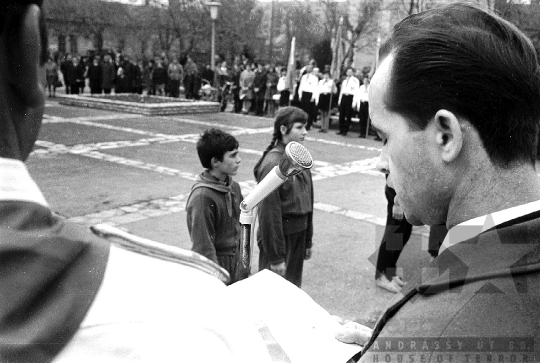 Ruzsa János, a megyei Kommunista Ifjúsági Szövetség titkára beszédet mond a szovjet emlékmű előtt.