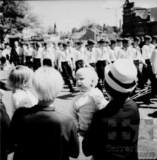 szocialista állami ünnep május 1. munka ünnepe felvonulás utcakép egyenruha úttörő ifjúsági mozgalmi élet gyerek Dombóvár Tolna megye Magyarország 1968 Bakó JenőFotó részletei