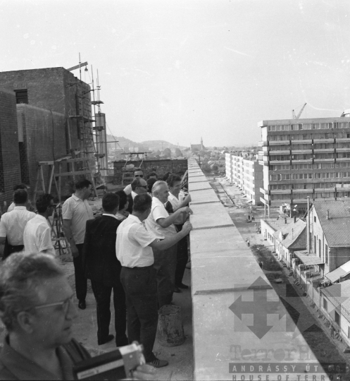 Vaszilij Iljics Csornij, Tambov területi pártbizottságának első titkára és K. Papp József, Tolna megyei pártbizottság első titkára egy épülő ház tetején.