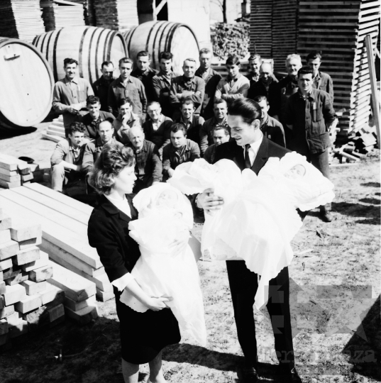 névadó család ünnepség pólya iker szövetkezet gerenda hordó szülő csecsemő Bátaszék Tolna megye Magyarország 1967 Bakó JenőFotó részletei