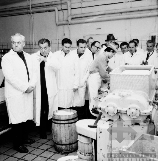 gyárlátogatás tejüzem MSZMP köpeny hordó párttitkár Szekszárd Tolna megye Magyarország 1968 Bakó JenőFotó részletei