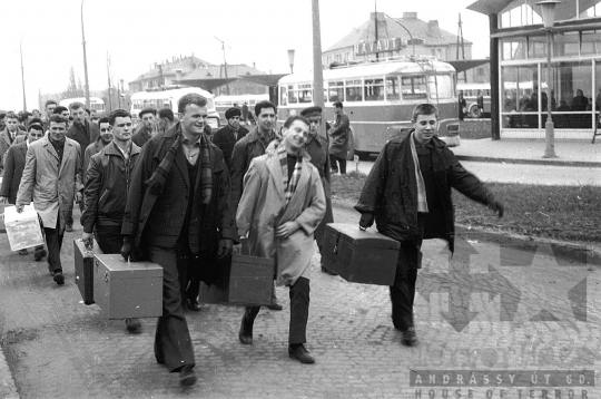 néphadsereg katonaság katona MÁVAUT katonaláda buszpályaudvar Ikarus busz Szekszárd Tolna megye Magyarország 1962 Bakó JenőFotó részletei