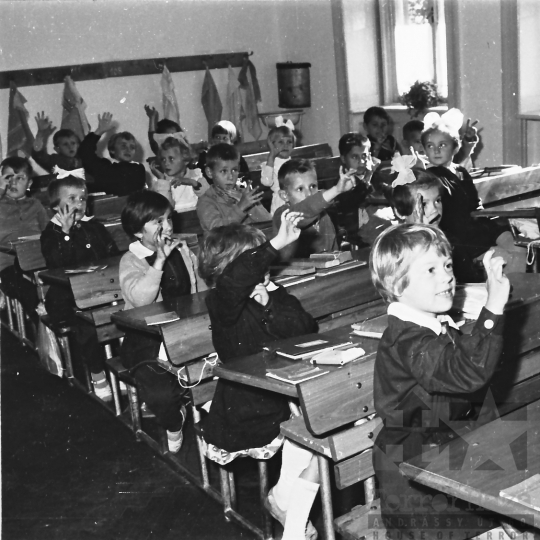 iskola általános iskola iskolapad tanterem diák köpeny tanóra osztály Decs Tolna megye Magyarország 1965 Bakó JenőFotó részletei