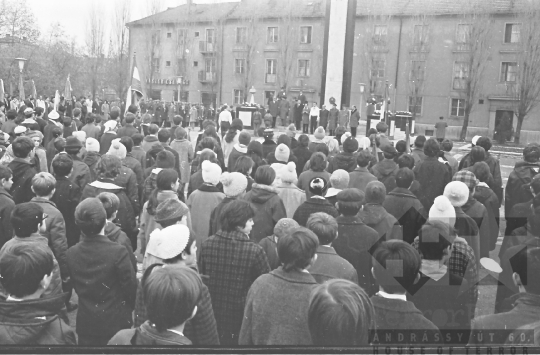 AZONOSÍTÓ: THM-BJ-00717 Férfi beszédet mond - transzparensen felirat: "Munkánk minőségének és hatékonyságának javításával, többletvállalásokkal készülünk a NAGY OKT. SZOC. FORR. 60. évfordulójára". [Az októberi orosz forradalom (kommunista propagandában: nagy októberi szocialista forradalom) 1917. november 6–12. (október 24–30.) között zajlott, amelynek során a bolsevikok a Téli Palota ostroma után az ott székelő Ideiglenes Kormány tagjait letartóztatták, és Lenin vezetésével, akit a Népbiztosok Tanácsa elnökévé választottak, puccsal átvették a hatalmat. Hazánkban ez a nap 1950-től 1989-ig pártállami ünnep volt.] [A szocialista brigádmozgalom szovjet mintára az 1950-es évek végén kezdett kibontakozni Magyarországon, és rendszerváltoztatáskor szűnt meg. Kezdetben csak az ipari üzemekben és gyárakban alakultak meg a brigádok, majd az agráriumban és a hivatali szférában is létrejöttek. A mozgalom jelszava: „Szocialista módon dolgozni, tanulni és élni” volt.] HELYSZÍN: Szekszárd, Tolna megye DÁTUM: 1977 FOTÓS: Bakó Jenő