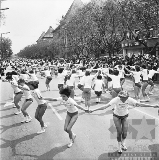 Diáklányok sportbemutatója Kommunista Ifjúsági Szövetség pólójában.