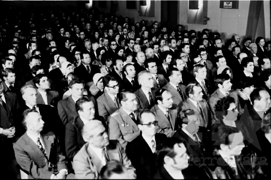 AZONOSÍTÓ: THM-BJ-00716a A rendezvény résztvevői. [A szocialista brigádmozgalom szovjet mintára az 1950-es évek végén kezdett kibontakozni Magyarországon, és rendszerváltoztatáskor szűnt meg. Kezdetben csak az ipari üzemekben és gyárakban alakultak meg a brigádok, majd az agráriumban és a hivatali szférában is létrejöttek. A mozgalom jelszava: „Szocialista módon dolgozni, tanulni és élni” volt.] HELYSZÍN: Szekszárd, Tolna megye DÁTUM: 1977 FOTÓS: Bakó Jenő
