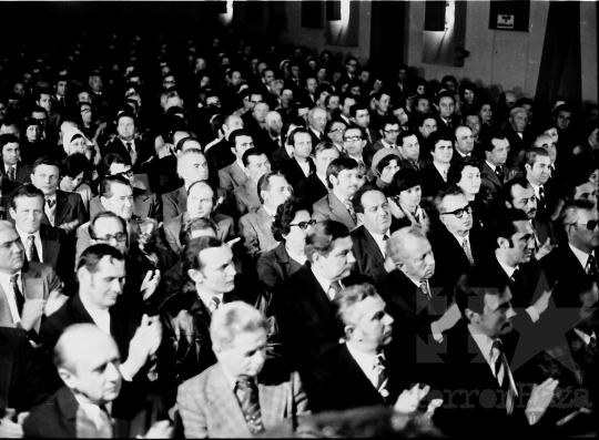 AZONOSÍTÓ: THM-BJ-00716a A rendezvény résztvevői. [A szocialista brigádmozgalom szovjet mintára az 1950-es évek végén kezdett kibontakozni Magyarországon, és rendszerváltoztatáskor szűnt meg. Kezdetben csak az ipari üzemekben és gyárakban alakultak meg a brigádok, majd az agráriumban és a hivatali szférában is létrejöttek. A mozgalom jelszava: „Szocialista módon dolgozni, tanulni és élni” volt.] HELYSZÍN: Szekszárd, Tolna megye DÁTUM: 1977 FOTÓS: Bakó Jenő