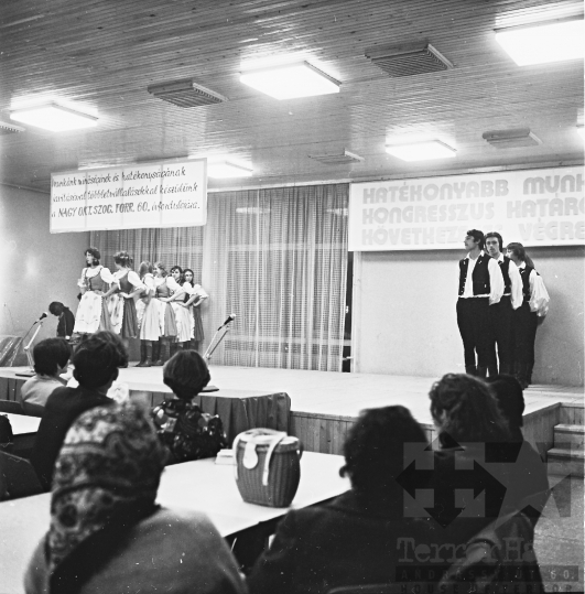 Néptánc produkció a színpadon - transzparenseken feliratok: "Hatékonyabb munkával a XI. pártkongresszus határozatainak következetes végrehajtásáért"