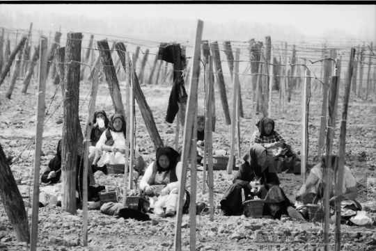 termelőszövetkezet kötény kendő kenyér abrosz kés kosár sváb nemzetiség szőlőtőke szőlőföld Báta Tolna megye 1985 Bakó Jenő MagyarországFotó részletei