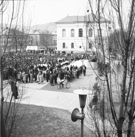 AZONOSÍTÓ: THM-BJ-00717 Férfi beszédet mond - transzparensen felirat: "Munkánk minőségének és hatékonyságának javításával, többletvállalásokkal készülünk a NAGY OKT. SZOC. FORR. 60. évfordulójára". [Az októberi orosz forradalom (kommunista propagandában: nagy októberi szocialista forradalom) 1917. november 6–12. (október 24–30.) között zajlott, amelynek során a bolsevikok a Téli Palota ostroma után az ott székelő Ideiglenes Kormány tagjait letartóztatták, és Lenin vezetésével, akit a Népbiztosok Tanácsa elnökévé választottak, puccsal átvették a hatalmat. Hazánkban ez a nap 1950-től 1989-ig pártállami ünnep volt.] [A szocialista brigádmozgalom szovjet mintára az 1950-es évek végén kezdett kibontakozni Magyarországon, és rendszerváltoztatáskor szűnt meg. Kezdetben csak az ipari üzemekben és gyárakban alakultak meg a brigádok, majd az agráriumban és a hivatali szférában is létrejöttek. A mozgalom jelszava: „Szocialista módon dolgozni, tanulni és élni” volt.] HELYSZÍN: Szekszárd, Tolna megye DÁTUM: 1977 FOTÓS: Bakó Jenő