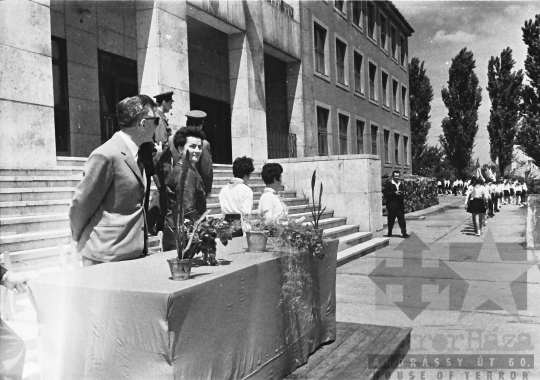 úttörő egyenruha avatás ünnepség általános iskola pódium ifjúsági mozgalmi élet iskola Szekszárd Tolna megye Magyarország 1968 Bakó JenőFotó részletei