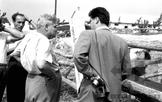 Dobi István a tamási termelőszövetkezetben beszélget egy férfival a karám mellett.