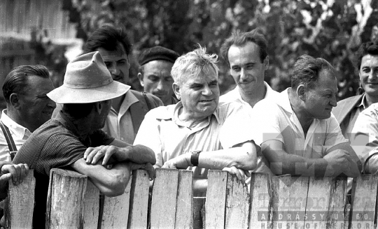 Dobi István a kerítésre támaszkodva áll a tamási termelőszövetkezetben helyiek gyűrűjében.