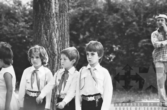 úttörő kisdobos egyenruha avatás ünnepség általános iskola ifjúsági mozgalmi élet iskola Mórágy Tolna megye Magyarország 1988 Bakó JenőFotó részletei