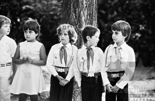 úttörő kisdobos egyenruha avatás ünnepség általános iskola ifjúsági mozgalmi élet iskola Mórágy Tolna megye Magyarország 1988 Bakó JenőFotó részletei
