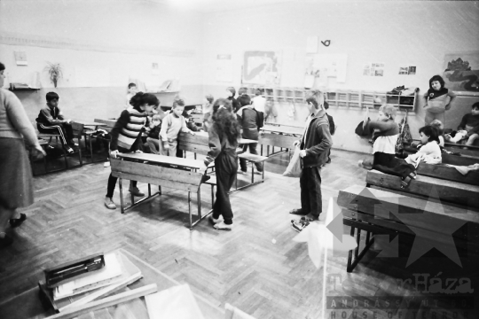 általános iskola iskola tornaóra tanterem osztály diák tornaruha iskolapad Mórágy Tolna megye Magyarország 1988 Bakó JenőFotó részletei