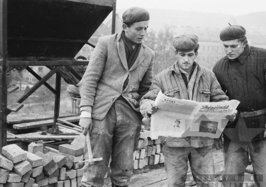 sajtó újság svájcisapka tégla csákány Szekszárd Tolna megye Magyarország 1967 Bakó JenőFotó részletei