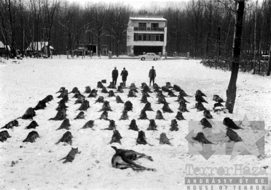 Kádár János és a gemenci fővadász, Parti István által lőtt 70 vaddisznó és őz kiterítve Keselyűsben a hóban.