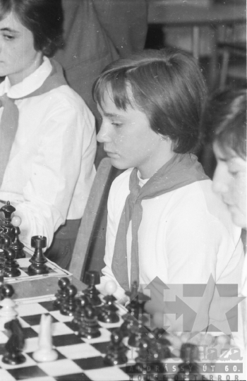 sakk úttörő egyenruha verseny sportoló sakktábla általános iskola szimultán játszma Szekszárd Tolna megye Magyarország 1965 Bakó JenőFotó részletei