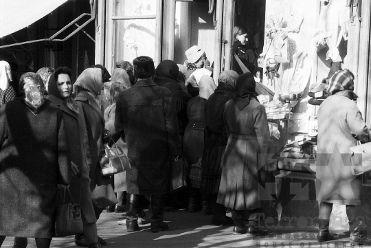 Sorbaállás egy bolt előtt a régi korzón, az egykori Mártírok (ma Széchenyi) térnél.