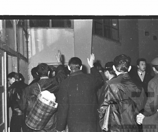 AZONOSÍTÓ: THM-BJ-00717 Férfi beszédet mond - transzparensen felirat: "Munkánk minőségének és hatékonyságának javításával, többletvállalásokkal készülünk a NAGY OKT. SZOC. FORR. 60. évfordulójára". [Az októberi orosz forradalom (kommunista propagandában: nagy októberi szocialista forradalom) 1917. november 6–12. (október 24–30.) között zajlott, amelynek során a bolsevikok a Téli Palota ostroma után az ott székelő Ideiglenes Kormány tagjait letartóztatták, és Lenin vezetésével, akit a Népbiztosok Tanácsa elnökévé választottak, puccsal átvették a hatalmat. Hazánkban ez a nap 1950-től 1989-ig pártállami ünnep volt.] [A szocialista brigádmozgalom szovjet mintára az 1950-es évek végén kezdett kibontakozni Magyarországon, és rendszerváltoztatáskor szűnt meg. Kezdetben csak az ipari üzemekben és gyárakban alakultak meg a brigádok, majd az agráriumban és a hivatali szférában is létrejöttek. A mozgalom jelszava: „Szocialista módon dolgozni, tanulni és élni” volt.] HELYSZÍN: Szekszárd, Tolna megye DÁTUM: 1977 FOTÓS: Bakó Jenő