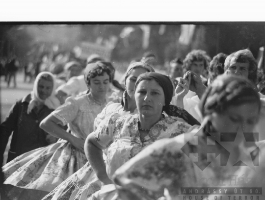 AZONOSÍTÓ: THM-BJ-00718 Néptánc produkció a színpadon - transzparenseken feliratok: "Hatékonyabb munkával a XI. pártkongresszus határozatainak következetes végrehajtásáért" "Munkánk minőségének és hatékonyságának javításával, többletvállalásokkal készülünk a NAGY OKT. SZOC. FORR. 60. évfordulójára". [Az októberi orosz forradalom (kommunista propagandában: nagy októberi szocialista forradalom) 1917. november 6–12. (október 24–30.) között zajlott, amelynek során a bolsevikok a Téli Palota ostroma után az ott székelő Ideiglenes Kormány tagjait letartóztatták, és Lenin vezetésével, akit a Népbiztosok Tanácsa elnökévé választottak, puccsal átvették a hatalmat. Hazánkban ez a nap 1950-től 1989-ig pártállami ünnep volt.] [A szocialista brigádmozgalom szovjet mintára az 1950-es évek végén kezdett kibontakozni Magyarországon, és rendszerváltoztatáskor szűnt meg. Kezdetben csak az ipari üzemekben és gyárakban alakultak meg a brigádok, majd az agráriumban és a hivatali szférában is létrejöttek. A mozgalom jelszava: „Szocialista módon dolgozni, tanulni és élni” volt.] HELYSZÍN: Szekszárd, Tolna megye DÁTUM: 1977 FOTÓS: Bakó Jenő