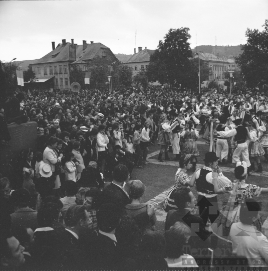 AZONOSÍTÓ: THM-BJ-00718 Néptánc produkció a színpadon - transzparenseken feliratok: "Hatékonyabb munkával a XI. pártkongresszus határozatainak következetes végrehajtásáért" "Munkánk minőségének és hatékonyságának javításával, többletvállalásokkal készülünk a NAGY OKT. SZOC. FORR. 60. évfordulójára". [Az októberi orosz forradalom (kommunista propagandában: nagy októberi szocialista forradalom) 1917. november 6–12. (október 24–30.) között zajlott, amelynek során a bolsevikok a Téli Palota ostroma után az ott székelő Ideiglenes Kormány tagjait letartóztatták, és Lenin vezetésével, akit a Népbiztosok Tanácsa elnökévé választottak, puccsal átvették a hatalmat. Hazánkban ez a nap 1950-től 1989-ig pártállami ünnep volt.] [A szocialista brigádmozgalom szovjet mintára az 1950-es évek végén kezdett kibontakozni Magyarországon, és rendszerváltoztatáskor szűnt meg. Kezdetben csak az ipari üzemekben és gyárakban alakultak meg a brigádok, majd az agráriumban és a hivatali szférában is létrejöttek. A mozgalom jelszava: „Szocialista módon dolgozni, tanulni és élni” volt.] HELYSZÍN: Szekszárd, Tolna megye DÁTUM: 1977 FOTÓS: Bakó Jenő
