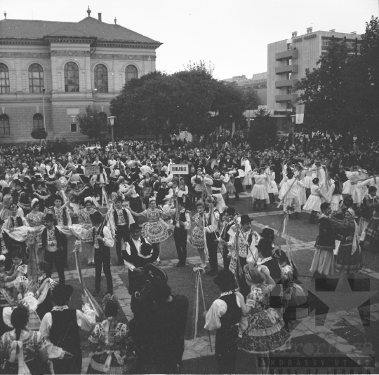 AZONOSÍTÓ: THM-BJ-00718 Néptánc produkció a színpadon - transzparenseken feliratok: "Hatékonyabb munkával a XI. pártkongresszus határozatainak következetes végrehajtásáért" "Munkánk minőségének és hatékonyságának javításával, többletvállalásokkal készülünk a NAGY OKT. SZOC. FORR. 60. évfordulójára". [Az októberi orosz forradalom (kommunista propagandában: nagy októberi szocialista forradalom) 1917. november 6–12. (október 24–30.) között zajlott, amelynek során a bolsevikok a Téli Palota ostroma után az ott székelő Ideiglenes Kormány tagjait letartóztatták, és Lenin vezetésével, akit a Népbiztosok Tanácsa elnökévé választottak, puccsal átvették a hatalmat. Hazánkban ez a nap 1950-től 1989-ig pártállami ünnep volt.] [A szocialista brigádmozgalom szovjet mintára az 1950-es évek végén kezdett kibontakozni Magyarországon, és rendszerváltoztatáskor szűnt meg. Kezdetben csak az ipari üzemekben és gyárakban alakultak meg a brigádok, majd az agráriumban és a hivatali szférában is létrejöttek. A mozgalom jelszava: „Szocialista módon dolgozni, tanulni és élni” volt.] HELYSZÍN: Szekszárd, Tolna megye DÁTUM: 1977 FOTÓS: Bakó Jenő