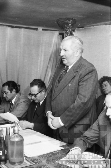 AZONOSÍTÓ: THM-BJ-00714 Férfi beszédet mond. [A szocialista brigádmozgalom szovjet mintára az 1950-es évek végén kezdett kibontakozni Magyarországon, és rendszerváltoztatáskor szűnt meg. Kezdetben csak az ipari üzemekben és gyárakban alakultak meg a brigádok, majd az agráriumban és a hivatali szférában is létrejöttek. A mozgalom jelszava: „Szocialista módon dolgozni, tanulni és élni” volt.] HELYSZÍN: Szekszárd, Tolna megye DÁTUM: 1977 FOTÓS: Bakó Jenő