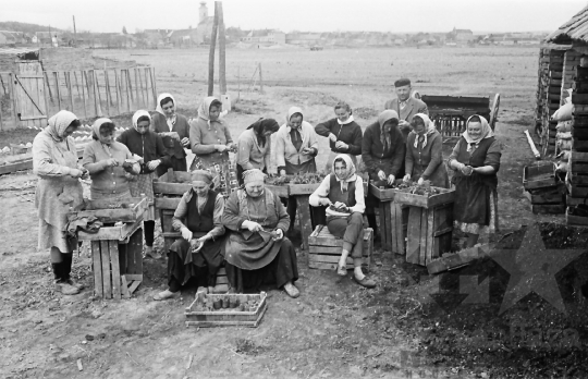 kertészet termelőszövetkezet kötény kendő láda Decs Tolna megye Magyarország 1966 Bakó JenőFotó részletei
