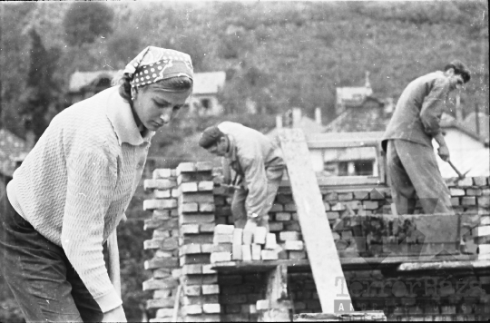 építkezés társadalmi munka egészségügy tégla kendő véradó központ kórház svájcisapka Szekszárd Tolna megye Magyarország 1966 Bakó JenőFotó részletei