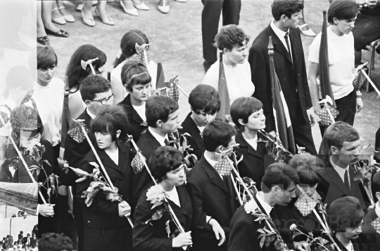 ballagás diák iskola szakközépiskola ünnepség évzáró ünneplő vándorbot virág zászló Szekszárd Tolna megye Magyarország 1968 Bakó JenőFotó részletei