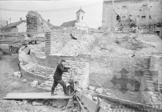 vár rekonstrukció műemlék talicska palló szállítószalag svájcisapka Simontornya Tolna megye Magyarország 1968 Bakó JenőFotó részletei