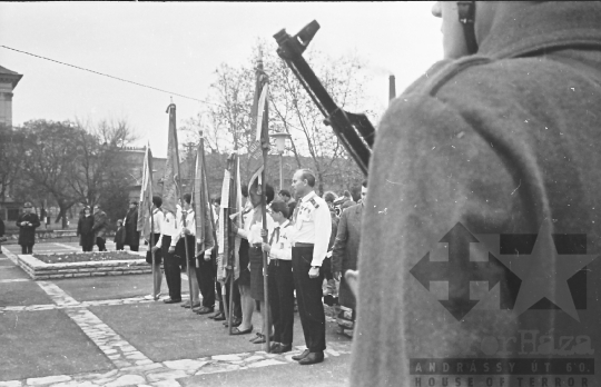 szocialista állami ünnep ifjúsági mozgalmi élet úttörő egyenruha csapatzászló szovjet emlékmű Szekszárd Tolna megye Magyarország 1968 Bakó JenőFotó részletei