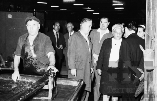 Vass Istvánné megtekinti az üzemcsarnokot.