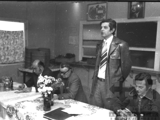 AZONOSÍTÓ: THM-BJ-00714 Férfi beszédet mond. [A szocialista brigádmozgalom szovjet mintára az 1950-es évek végén kezdett kibontakozni Magyarországon, és rendszerváltoztatáskor szűnt meg. Kezdetben csak az ipari üzemekben és gyárakban alakultak meg a brigádok, majd az agráriumban és a hivatali szférában is létrejöttek. A mozgalom jelszava: „Szocialista módon dolgozni, tanulni és élni” volt.] HELYSZÍN: Szekszárd, Tolna megye DÁTUM: 1977 FOTÓS: Bakó Jenő