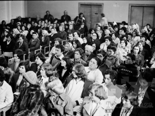AZONOSÍTÓ: THM-BJ-00716a A rendezvény résztvevői. [A szocialista brigádmozgalom szovjet mintára az 1950-es évek végén kezdett kibontakozni Magyarországon, és rendszerváltoztatáskor szűnt meg. Kezdetben csak az ipari üzemekben és gyárakban alakultak meg a brigádok, majd az agráriumban és a hivatali szférában is létrejöttek. A mozgalom jelszava: „Szocialista módon dolgozni, tanulni és élni” volt.] HELYSZÍN: Szekszárd, Tolna megye DÁTUM: 1977 FOTÓS: Bakó Jenő