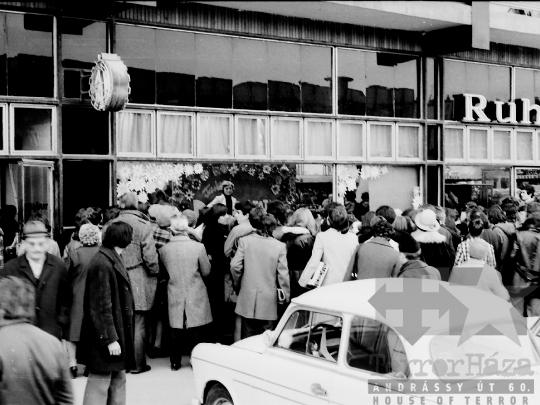 divatbemutató kirakat ÁFÉSZ áruház neonreklám Trabant autó Szekszárd Tolna megye Magyarország 1977 Bakó JenőFotó részletei