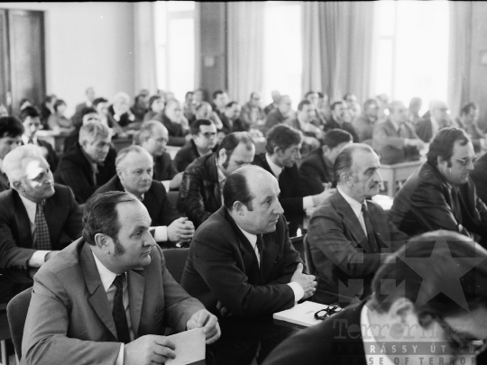 AZONOSÍTÓ: THM-BJ-00716a A rendezvény résztvevői. [A szocialista brigádmozgalom szovjet mintára az 1950-es évek végén kezdett kibontakozni Magyarországon, és rendszerváltoztatáskor szűnt meg. Kezdetben csak az ipari üzemekben és gyárakban alakultak meg a brigádok, majd az agráriumban és a hivatali szférában is létrejöttek. A mozgalom jelszava: „Szocialista módon dolgozni, tanulni és élni” volt.] HELYSZÍN: Szekszárd, Tolna megye DÁTUM: 1977 FOTÓS: Bakó Jenő