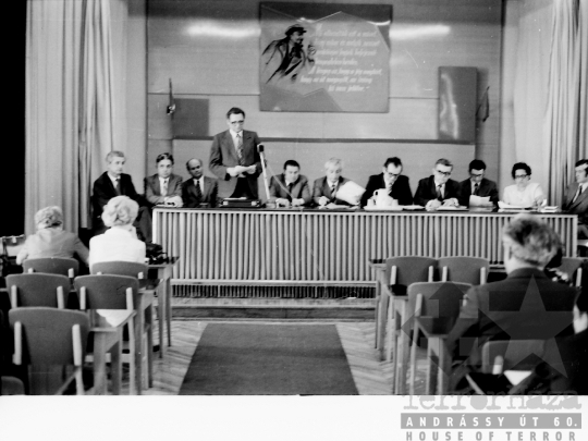 közgyűlés beszéd pódium mikrofon transzparens Szekszárd Tolna megye Magyarország 1977 Bakó JenőFotó részletei