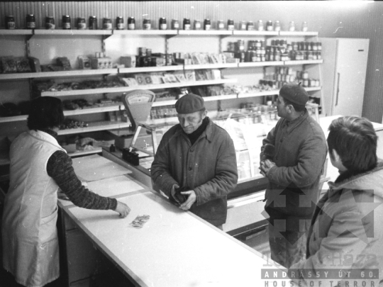 bolt vásárló szárazáru mérleg pult svájcisapka eladó köpeny népbolt Kajmádpuszta Tolna megye 1978 Bakó Jenő MagyarországFotó részletei