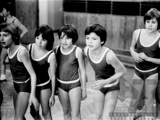 általános iskola diák iskola tornaterem tornaóra tornaruha Szekszárd Tolna megye Magyarország 1978 Bakó JenőFotó részletei