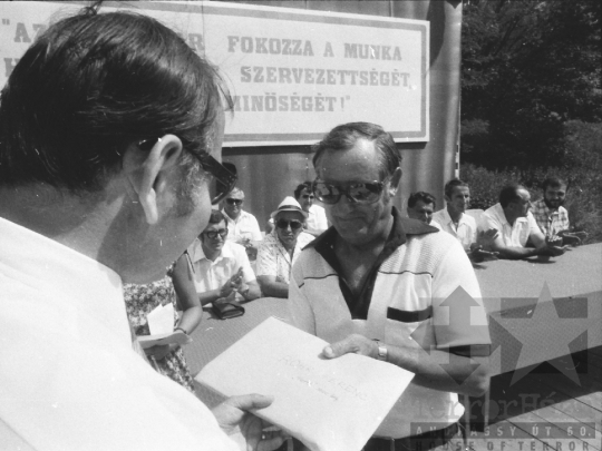 AZONOSÍTÓ: THM-BJ-00714 Férfi beszédet mond. [A szocialista brigádmozgalom szovjet mintára az 1950-es évek végén kezdett kibontakozni Magyarországon, és rendszerváltoztatáskor szűnt meg. Kezdetben csak az ipari üzemekben és gyárakban alakultak meg a brigádok, majd az agráriumban és a hivatali szférában is létrejöttek. A mozgalom jelszava: „Szocialista módon dolgozni, tanulni és élni” volt.] HELYSZÍN: Szekszárd, Tolna megye DÁTUM: 1977 FOTÓS: Bakó Jenő