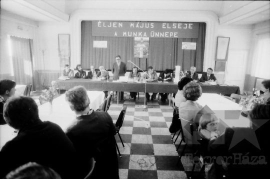 szocialista állami ünnep május 1. munka ünnepe beszéd transzparens mikrofon Simontornya Tolna megye Magyarország 1981 Bakó JenőFotó részletei